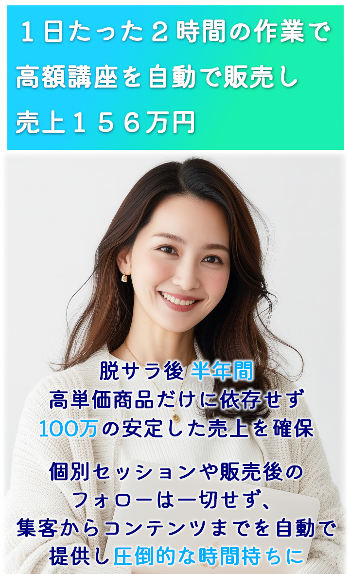なぜなら、個別セッションとサポートに追われる日々から解放され、あなたが寝ている間にも高額講座がポンポン売れて、月末にはお金が自動的に振り込まれるからです。