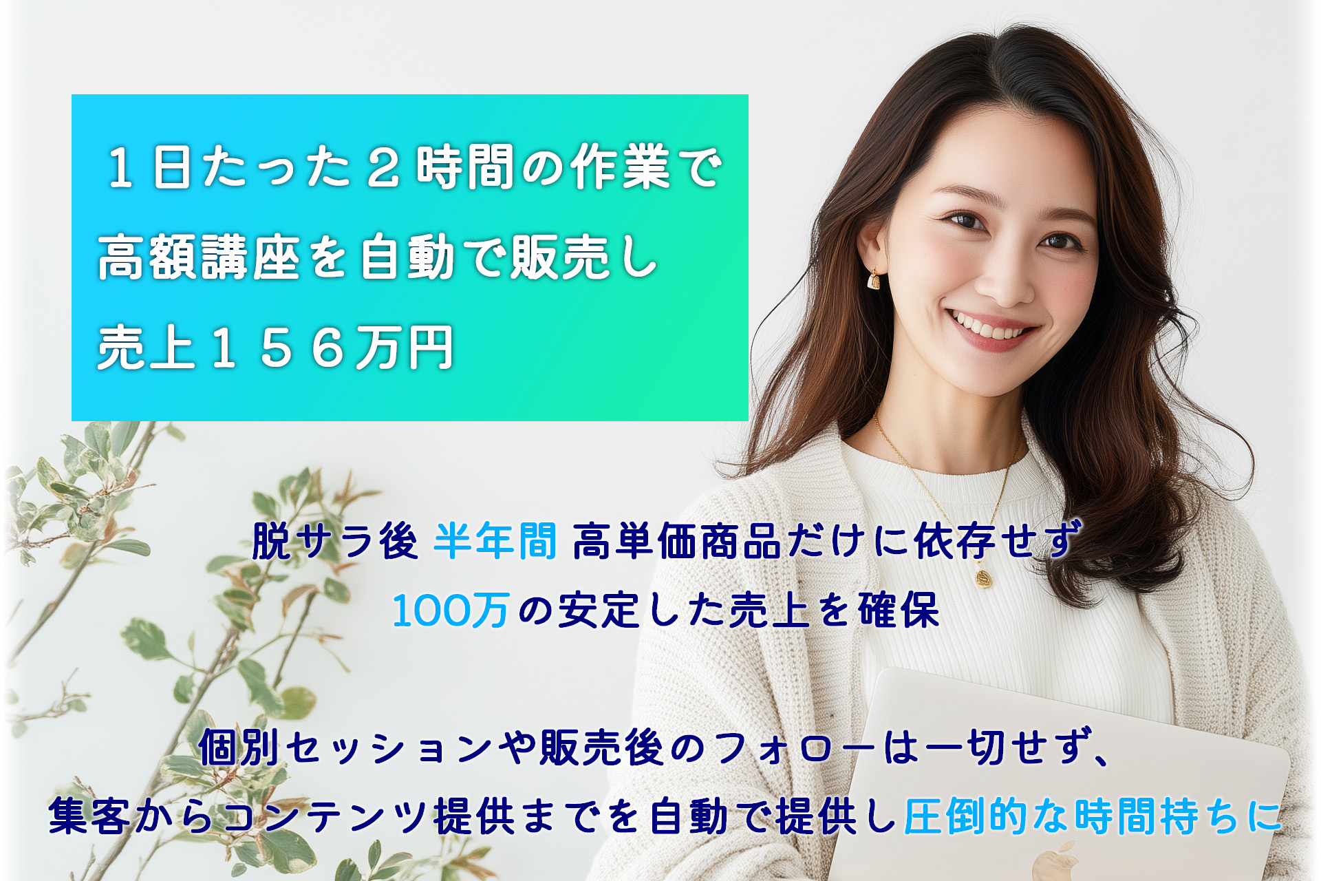 結果、あなたは集客とセールスに追われる毎日から抜け出し、「作業は1日2時間、残りは家族と自分の時間」というリズムに切り替えられます。